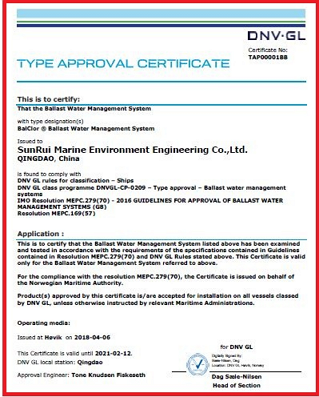 On April 6, 2018,  SunRui Marine Environment Engineering Company Ltd (hereinafter referred to as SunRui) ‘s BalClor?   ballast water management system (BWMS), was issued the new IMO G8 & G9 certification by DNV GL, acting on behalf of the Norwegian Maritime Authority (NMA). This is another significant milestone for SunRui Company after it was the fourth globally and the first in Asia to be awarded United States Coast Guard (USCG) type approval certification. SunRui’s IMO revised G8 & G9 certified BalClor? BWMS uses world’s leading high-performance filtration + indirect electrolysis technology, having treatment capacity of 170 ?C 8500 m3/h.