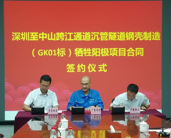 7月19日,深中通道海底隧道工程全部標段犧牲陽極陰極保護項目簽約儀式在廣船國際、黃埔文沖船廠舉行,青島雙瑞海洋環境工程股份有限公司(以下簡稱青島雙瑞公司)中標該項目。該項目的陰極保護工程合同總額近1.8億元,是迄今為止我國最大的犧牲陽極陰極保護合同。