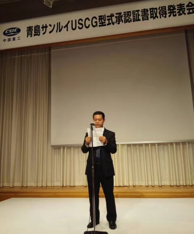 發布會上,青島雙瑞公司總經理付洪田致歡迎詞,介紹了公司船舶壓載水管理系統USCG認證歷程以及產品生產制造、全球服務網絡中遠期規劃。日本最具影響力的船東公司日本郵船株式會社(NYK Line)經營委員在發布會上做祝酒詞,他對青島雙瑞公司船舶壓載水管理系統給予高度評價并表達了與青島雙瑞公司建立長期合作的意愿。